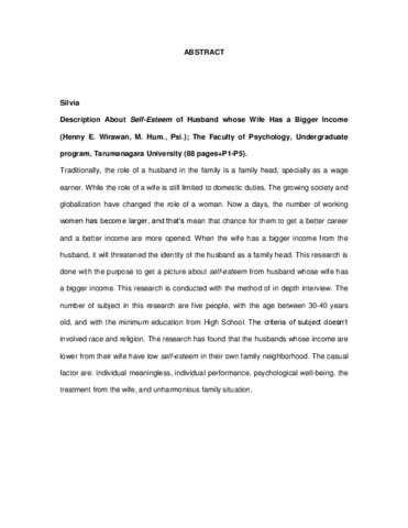 Silvia, Silvia (2007) Gambaran harga diri suami yang memiliki istri dengan penghasilan lebih besar. Skripsi thesis, Universitas Tarumanagara.
