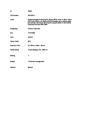 idya Sari, Trianna (2011) Analisis pengaruh Earning Per Share (EPS), Price To Book Value (PBV), dan Return On Equity (ROE) terhadap return saham pada perusahaan real estate dan properti yang terdaftar di Bursa Efek Indonesia Periode 2007-2009. Masters thesis, UNIVERSITAS TARUMANAGARA.