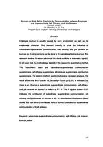 Employee burnout is usually caused by work environment as well as the employee’s character. This research intends to prove the influence of subordinate-superordinate communication, self efficacy, and job stressor on burnout, so the interventions can be done to the variables affecting burnout. This research involves 71 editors who work for a local publisher in Indonesia, aged 22 to 55 years old. The methodology applied in this research is quantitative method. The instruments used are subordinate-superordinate communication questionnaire, self efficacy questionnaire, job stressor questionnaire, and burnout questionnaire. The statistic method used is multivariate regression analysis. The result shows that the F score= 15,298 and p= 0,000 (p< 0,01). It indicates that there is an influence of subordinate -superordinate communication, self efficacy, and job stressor on burnout to editors at PT X. The R square score= 0,407 indicates the contribution of subordinate -superordinate communication, self efficacy, and job stressor on burnout is 40,7%. Standardized Coefficients (Beta) shows that self efficacy contributes more to burnout compared to superordinate communication and job stressor.