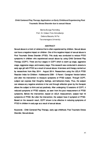 Sexual abuse is a form of violence that is often experienced by children. Sexual abuse can have a negative impact on children. One of the negative impact of sexual abuse is Post Traumatic Stress Disorder (PTSD). This study was conducted to reduce PTSD symptoms in children who experienced sexual abuse by using Child Centered Play Therapy (CCPT). There are four stages in CCPT which is warm-up stage, aggresive stage, reggresive stage, and mastery stage. This research was conducted in Jakarta to early age girl with PTSD as a result of sexual abuse. Interviews and therapy carried out by researchers from May 2014 - August 2014. Researchers using the UCLA PTSD Reaction Index for Children / Adolescents DSM - 5 Parent / Caregiver Version before and after the intervention to measure symptoms of PTSD subject. Through CCPT, subject can express their thoughts, feelings, and behaviors freely. Thus, the subject can release any negative emotions in her and through reflection given by the therapist allows the subject to think and act positively. After undergoing 12 sessions of CCPT, it reduced symptoms of PTSD subjects, as seen from the post measurement of PTSD symptoms. Before the intervention, based on UCLA measurement, subject had 18 symptoms of PTSD. But after the intervention, the subject have 0 symptom of PTSD. Based on the research result, CCPT shown to be effective in reducing symptoms of PTSD in children in early age as a result of sexual abuse.