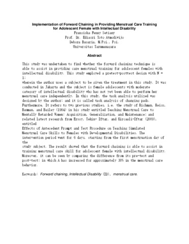 "This study was undertaken to find whether the forward chaining technique is able to assist in providing care menstrual training for adolescent females with intellectual disability. This study employed a pretest-posttest design with N = 1; wherein the author uses a subject to be given the treatment in this study . It was conducted in Jakarta and the subject is female adolescents with moderate category of intellectual disability who has not yet been able to perform her menstrual care independently. In this study, the task analysis utilized was designed by the author; and it is called task analysis of changing pads. Furthermore, It refers to two previous studies, i.e. the study of Richman, Reiss, Bauman, and Bailey (1984) in his study entitled Teaching Menstrual Care to Mentally Retarded Women: Acquisition, Generalization, and Maintenance; and related latest research from Ersoy, Tekin- Iftar, and Kircaali-Iftar (2009), entitled Effects of Antecedent Prompt and Test Procedure on Teaching Simulated Menstrual Care Skills to Females with Developmental Disabilities. The intervention period went for6 days, starting from the firstmenstruation day of the study subject. The result showed that the forward chaining is able to assist in training menstrual care skill for adolescent female with intellectual disability. Moreover, it can be seen by comparing the difference from its pre-test and post-test; in which A has increased for approximately 30% in the menstrual care behavior.