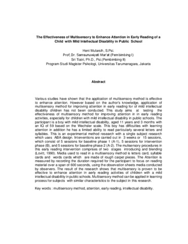 Various studies have shown that the application of multisensory method is effective to enhance attention. However based on the author's knowledge, application of multisensory method for improving attention in early reading for of mild intellectual disability children has not been conducted. This study aims at testing the effectiveness of multisensory method for improving attention in in early reading activities, especially for children with mild intellectual disability in public schools. The participant is a boy with mild intellectual disability, aged 11 years and 3 months with an IQ of 59 based on the Wechsler scale. This boy has difficulties with learning attention in addition he has a limited ability to read particularly several letters and syllables. This is an experimental method research with a single subject research which uses ABA design. Interventions are carried out in 3 weeks or 15 sessions, which consist of 5 sessions for baseline phase 1 (A-1), 5 sessions for intervention phase (B), and 5 sessions for baseline phase 2 (A-2). The mulisensory procedures in this early reading intervention comprises of two stages introducing and blending (Lovitt, 1990). Media used to read in a multisensory method is letters card, syllable cards and words cards which are made of rough carpet pieces. The Attention is measured by recording the duration required for the participant to focus on reading material over a span of 600 seconds, using the observation sheets media conducted by observers. The result of the research shows that multisensory is proven to be effective to enhance attention in aerly reading activities of children with a mild intellectual disabilitiy in public schools. Multisensory method can be applied in learning process for subjects with similar characteristics to the subject in this research.