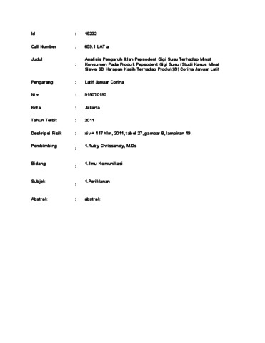 Januar Corina, Latif (2001) Analisis Pengaruh Iklan Pepsodent Gigi Susu Terhadap Minat Konsumen Pada Produk Pepsodent Gigi Susu (Studi Kasus MInat Siswa SD Harapan Kasih Terhadap Produk)/3) Corina Januar Latif. Skripsi thesis, UNIVERSITAS TARUMANAGARA.