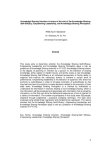 This study aims to determine whether the Knowledge Sharing Self-Efficacy, Empowering Leadership and Knowledge Sharing Perception plays a role as predictors of Knowledge Sharing Intention in PT XYZ. Knowledge Sharing Intetion is the degree of planning or intention by a person to the behavior of sharing knowledge, either explicit or implicit nature, and jointly create a new knowledge. Knowledge Sharing Self-Efficacy is an individual assessment of his/her ability to organize and execute the necessary actions to achieve a certain level of performance. Empowering leadership is the behavior of superiors who share his authority to subordinates in order to increase motivation of subordinates so that they feel they have the authority to make decisions related to the execution of their daily tasks. Knowledge Sharing Perception is a method by individuals to understand the information it receives relating to the knowledge sharing, which is the information will be processed and associated with information that is owned by the person, so that they can show the behavioral response as a form of reaction to a variety of information. The number of participants in this study were 253 people, obtained through judgmental / purposive sampling technique. The data were analyzed using simple linear regression and multiple linear regression. The results showed that the Knowledge Sharing Self-Efficacy, Empowering Leadership and Knowledge Sharing Perception plays a role as a predictor of Knowledge Sharing Intention in PT XYZ.