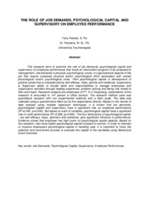 This research aims to examine the role of job demands, psychological capital and supervisory on employee performance that result an intervention program to be proposed to management. Job demands is physical, psychological, social, or organizational aspects of the job that require sustained physical and/or psychological effort associated with certain physiological and/or psychological costs. Then psychological capital is development of positive sense that is characterized by self-efficacy, hope, optimis and resilience. Supervisory is Supervisor ability to handle tasks and responsibilities to manage employees and organization activities through leading experience, problem solving and being role model to their work team. Research subjects are employees of PT. X in Tengerang, respondents of this research is amounted to 141 person in office division. The research method used was quantitative research with non experimental methods with a likert scale. The data was collected using a questionnaire filled out by the respondents directly. Based on the results of data analysis using multiple regression techniques, it is known that job demands, psychological capital and supervisory have a significant role on employee performance (R2=0.345, p=0.000). But based on each of variables, psychological capital have a significant role on work performance (R2=0.296, p=0.000). The four dimensions of psychological capital, - are self efficacy, hope, optimism and resilience, give significant influence in performance. Evidence shows that employee has high score on psychological capital aspects. Based on this research, men have higher psychological capital compare to women. In order to maintain or improve employee's psychological capital in handling task, it is important to focus the selection and recruitment process to evaluate this capital of the candidate using Behavioral Event Interview.