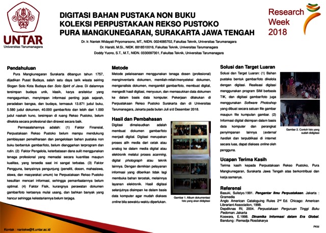 Priyomarsono, Naniek Widayati and Harsiti, Harsiti and Yuono, Doddy (2018) DIGITASI BAHAN PUSTAKA NON BUKU KOLEKSI PERPUSTAKAAN REKSO PUSTOKO PURA MANGKUNEGARAN, SURAKARTA JAWA TENGAH. In: Researck Week 2018, 2018, Universitas Tarumanagara.