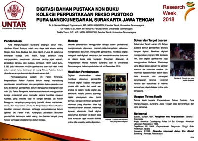 Poster Research Week 2018 Internal Untar - Digitalisasi Perpustakaan Rekso Puro.pdf Download (826kB) | Preview |