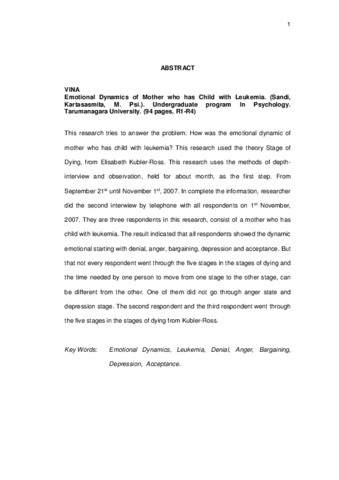 This research tries to answer the problem: How was the emotional dynamic of mother who has child with leukemia? This research used the theory Stage of Dying, from Elisabeth Kubler-Ross. This research uses the methods of depth-interview and observation, held for about month, as the first step. From September 21st until November 1st, 2007. In complete the information, researcher did the second interwiew by telephone with all respondents on 1st November, 2007. They are three respondents in this research, consist of a mother who has child with leukemia. The result indicated that all respondents showed the dynamic emotional starting with denial, anger, bargaining, depression and acceptance. But that not every respondent went through the five stages in the stages of dying and the time needed by one person to move from one stage to the other stage, can be different from the other. One of them did not go through anger state and depression stage. The second respondent and the third respondent went through the five stages in the stages of dying from Kubler-Ross.