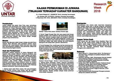 Priyomarsono, Naniek Widayati and Ninawati, Ninawati and Surya, Rudy (2018) KAJIAN PERMUKIMAN DI JUWANA (TINJAUAN TERHADAP KARAKTER BANGUNAN). In: Researck Week 2018, 2018, Universitas Tarumanagara.