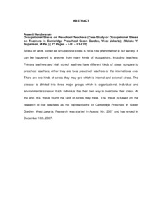 Stress on work, known as occupational stress is not a new phenomenon in our society. It can be happened to anyone, from many kinds of occupations, including teachers. Primary teachers and high school teachers have different kinds of stress compare to preschool teachers; either they are local preschool teachers or the international one. There are two kinds of stress they may get, which is internal and external stress. The stressor is divided into three major groups which is organizational, individual and environmental stressor. Each individual has their own way to overcome their stress. At the end, this thesis found the kind of stress they have. This thesis is based on the research of five teachers as the representative of Cambridge Preschool in Green Garden, West Jakarta. Research was started in August 9th, 2007 and has ended in December 18th, 2007.
