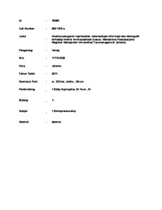 Vendy, Vendy (2011) Analisis pengaruh kepribadian, ketersediaan informasi dan demografi terhadap intensi kewirausahaan (kasus: Mahasiswa Pascasarjana Magister Manajemen Universitas Tarumanagara di Jakarta. Masters thesis, UNIVERSITAS TARUMANAGARA.