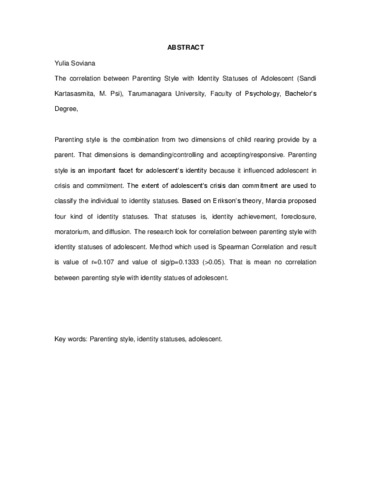 Soviana, Yulia (2008) Hubungan antara pola asuh dengan status identitas remaja. Skripsi thesis, Universitas Tarumanagara.