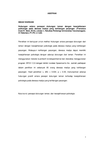 Wardani, Indah (2008) Hubungan antara persepsi dukungan teman dan kesejahteraan psikologis pada dewasa madya yang kehilangan pasangan. Skripsi thesis, Universitas Tarumanagara.