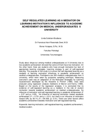 Budiarso, Linda Sulistiani (2015) Self-regulated learning sebagai mediator dalam peran motivasi belajar terhadap prestasi akademik pada mahasiswa Fakultas Kedokteran Universitas X. Masters thesis, Universitas Tarumanagara.