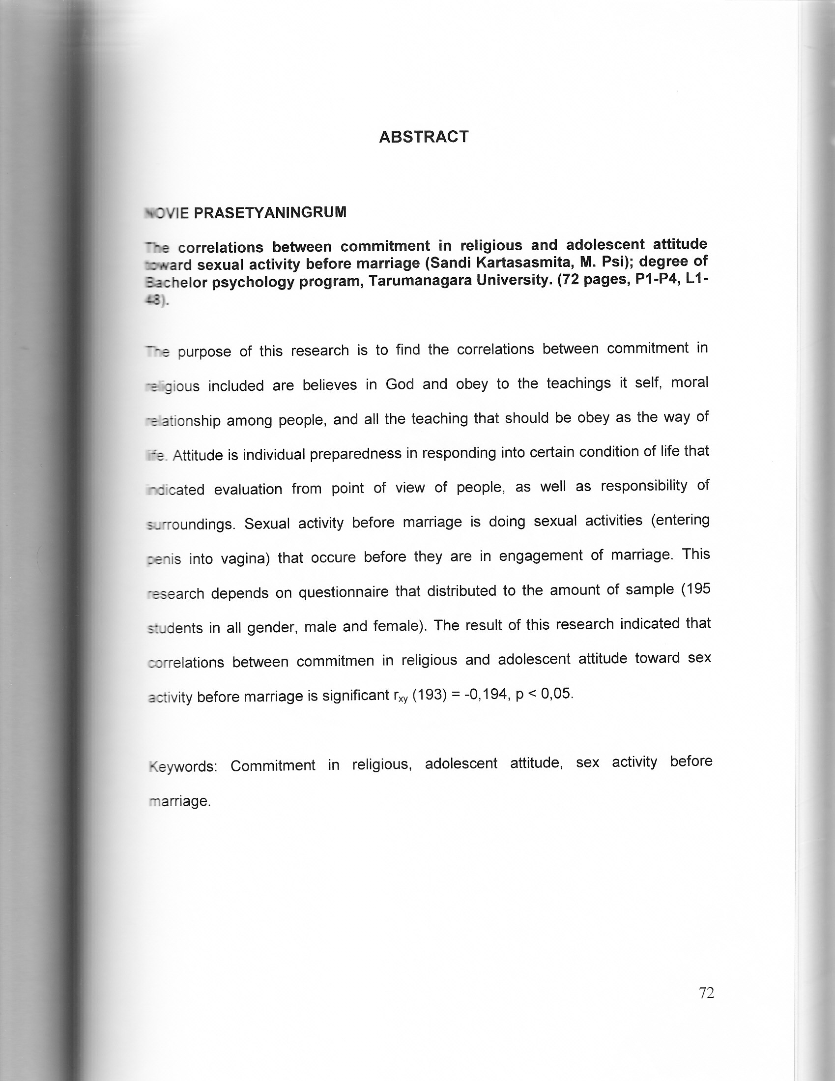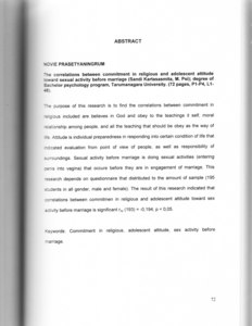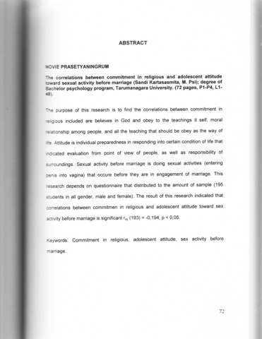 "Thee purpose of this research is to find the correlations between commitment in pious included are believes in God and obey to the teachings it self, moral ationship among people, and all the teaching that should be obey as the way of 'e. Attitude is individual preparedness in responding into certain condition of life that -:Icated evaluation from point of view of people, as well as responsibility of s.,-roundings. Sexual activity before marriage is doing sexual activities (entering :enis into vagina) that occure before they are in engagement of marriage. This -esearch depends on questionnaire that distributed to the amount of sample (195 students in all gender, male and female). The result of this research indicated that -1,yrelations between commitmen in religious and adolescent attitude toward sex activity before marriage is significant rxy (193) = -0,194, p < 0,05.