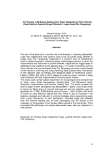 "The aim of this study is to know the role of art therapy in reducing adolescents’ anger who neglected by their parents (case study of juvenile drugs offender in Lapas Anak Pria Tangerang). Neglected is a common form of maltreatment which is related to poverty, substance abuse, and disregard parents, in which the characteristics are often seen in juvenile offender. Neglected can trigger anger in adolescents that lead them to the abusing drugs. This study involved two juvenile drugs offender that stays in Lapas Anak Pria Tangerang who were chosen based on the results of screening test using Parenting Style Questionnaire. Intervention in this research used art therapy and designed based on Malchiodi’s (2001); Pittam’s (2008); and Miller’s (2012) stages of reducing anger, involved 4 steps and 9 sessions with time implementation of three session a week.