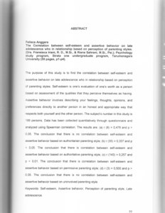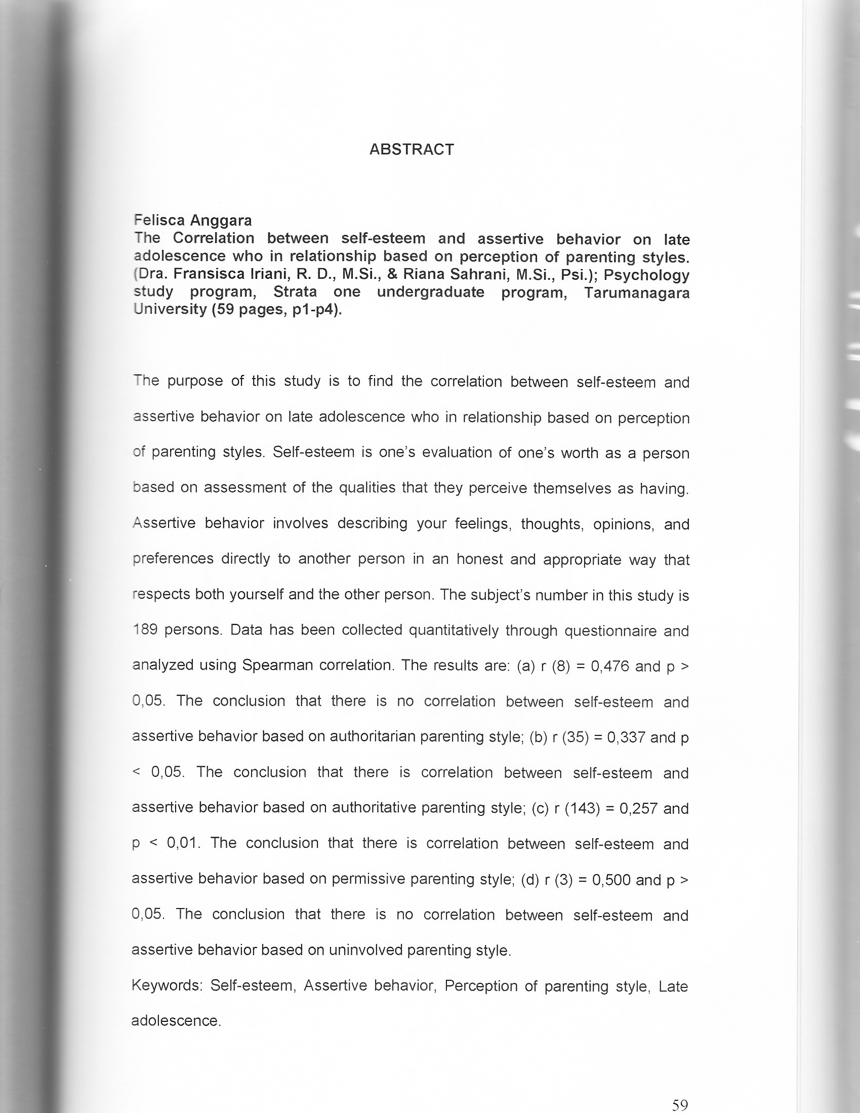 The purpose of this study is to find the correlation between self-esteem and assertive behavior on late adolescence who in relationship based on perception parenting styles. Self-esteem is one's evaluation of one's worth as a person cased on assessment of the qualities that they perceive themselves as having. :-.,ssertive behavior involves describing your feelings, thoughts, opinions, and preferences directly to another person in an honest and appropriate way that -espects both yourself and the other person. The subject's number in this study is 189 persons. Data has been collected quantitatively through questionnaire and analyzed using Spearman correlation. The results are: (a) r (8) = 0,476 and p > 3.05. The conclusion that there is no correlation between self-esteem and assertive behavior based on authoritarian parenting style; (b) r (35) = 0.337 and p < 0.05. The conclusion that there is correlation between self-esteem and assertive behavior based on authoritative parenting style; (c) r (143) = 0,257 and p < 0,01. The conclusion that there is correlation between self-esteem and assertive behavior based on permissive parenting style; (d) r (3) = 0,500 and p > 0.05. The conclusion that there is no correlation between self-esteem and assertive behavior based on uninvolved parenting style