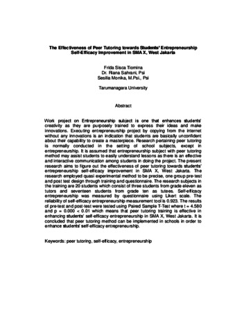 Tiomina, Frida Sisca (2015) Efektivitas peer toturing terhadap peningkatan self-efficacy enterpreneurship siswa di SMA X Jakarta Barat. Masters thesis, Universitas Tarumanagara.