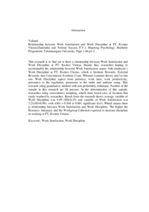 ascertainable the relationship between Work Satisfaction aspect with employee’s Work Discipline at PT. Kwinto Viratus, which is Intrinsic Rewards, External Rewards, dan Convenience Extrinsic Costs. Whereas Lateiner theory and Levine saw Work Discipline aspect from presence, work time, work productivity, pursuance to the regulation, pursuance to the order and uniform using. This research using quantitative method with non-probability technique. Number of the sample in this research are 88 persons. In the determination of this sample, researcher using convenience sampling, which done based easy of location that easily reached by researcher. Result from the research shows average variable of Work Discipline was 4.49 (SD=0.35) and variable of Work Satisfaction was 3.21(SD=0.99), with r(86) = 0.568 at 0.001 significant level. Which means there is relationship between Work Satisfaction and Work Discipline. The higher the Resource Adequacy and the Workgroup Cohesion expected to increase discipline in working at PT. Kwinto Viratus."