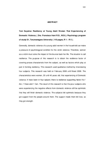Suyatna, Yeni (2008) Resiliensi pada wanita dewasa muda yang mengalami kekerasan dalam rumah tangga. Skripsi thesis, Universitas Tarumanagara.