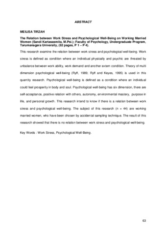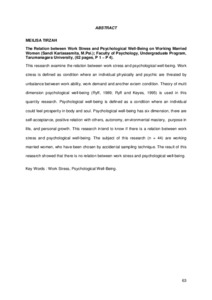 This research examine the relation between work stress and psychological well-being. Work stress is defined as condition where an individual physically and psychic are threated by unbalance between work ability, work demand and another extern condition. Theory of multi dimension psychological well-being (Ryff, 1989; Ryff and Keyes, 1995) is used in this quantity research. Psychological well-being is defined as a condition where an individual could feel prosperity in body and soul. Psychological well-being has six dimension, there are self-acceptance, positive relation with others, autonomy, environmental mastery, purpose in life, and personal growth. This research intend to know if there is a relation between work stress and psychological well-being. The subject of this research (n = 44) are working married women, who have been chosen by accidental sampling technique. The result of this research showed that there is no relation between work stress and psychological well-being.