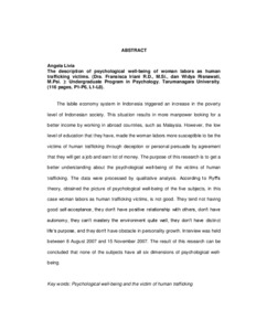 "The labile economy system in Indonesia triggered an increase in the poverty level of Indonesian society. This situation results in more manpower looking for a better income by working in abroad countries, such as Malaysia. However, the low level of education that they have, made the woman labors more susceptible to be the victims of human trafficking through deception or personal persuade by agreement that they will get a job and earn lot of money. The purpose of this research is to get a better understanding about the psychological well-being of the victims of human trafficking. The data were processed by qualitative analysis. According to Ryff’s theory, obtained the picture of psychological well-being of the five subjects, in this case woman labors as human trafficking victims, is not good. They tend not having good self-acceptance, they don’t have positive relationship with others, don’t have autonomy, they can’t mastery the environment quite well, they don’t have distinct life’s purpose, and they don’t have obstacle in personality growth. Interview was held between 8 August 2007 and 15 November 2007. The result of this research can be concluded that none of the subjects have all six dimensions of psychological well-being.
