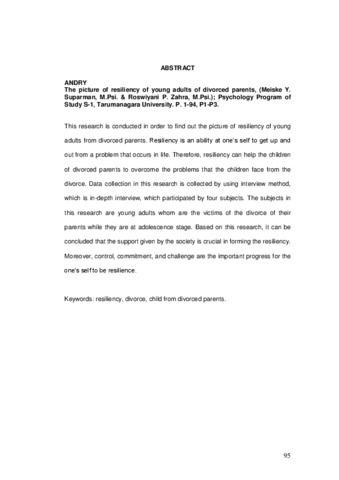 This research is conducted in order to find out the picture of resiliency of young adults from divorced parents. Resiliency is an ability at one’s self to get up and out from a problem that occurs in life. Therefore, resiliency can help the children of divorced parents to overcome the problems that the children face from the divorce. Data collection in this research is collected by using interview method, which is in-depth interview, which participated by four subjects. The subjects in this research are young adults whom are the victims of the divorce of their parents while they are at adolescence stage. Based on this research, it can be concluded that the support given by the society is crucial in forming the resiliency. Moreover, control, commitment, and challenge are the important progress for the one’s self to be resilience.