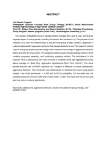 The number of students’ brawl in Jakarta tend to increase from year to year, and it gives negative impact to many parties, including the person who involves in its. The purpose of this research is to know the effectiveness of solution brief group therapy (SFBGT) approach in reducing adolescents’ aggressive behavior that causes students’ brawl. The research method used is one-group pretest-posttest design which measure the change of aggressive behavior before and after the intervention. The sampling method used is mixed sampling method, which combine purposive sampling, and confirming sampling method. The participants in this research were 5 adolescents who were involved in students’ brawl with aggressions scored above average on Buss-Perry Aggression Questionaire-Short Form (AQ-SF). The result showed that the use of SFBGT approach for 7 session is effective to reduce adolescents’ aggressive behavior. This conclusion was made based on statistical test result using paired sample t test which generated t = 4.333 with 0.012 for probability. For two-tailed test, the probability become 0,012/2=0.006 which mean 0.006 < 0.025. This mean that the pre-test and post-test score is reduce significantly.
