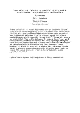 Adolescence is one phase of life and a time where one teen emotion can easily change. Resulting, emotional-aggressivity, because of the emotion-turmoil and their inability to control it, which causing aggresive behavior in both physical and verbal. One need the ability to regulate their emotion well, so they can control their emotion, from positive or negative. Intervention which is conducted in this research is an Art Therapy, with 9 sessions and done individually. There are 6 boy participants. One session of this Art Therapy spend time 60-90 minutes, with different activities. One of the activity is, painting or drawing with crayon, color pencil, and water paint. After it’s finished, then the result is that Art Therapy did well in increasing emotion regulation and decreasing physical aggresivity in all the participants. But, after the intervension done, it shows that there’s two participants doesnt changed for a long time, only four participants remains different after did the therapy. The purpose of this research is to improve emotion regulation and decreasing physical aggresivity in 6 participants.