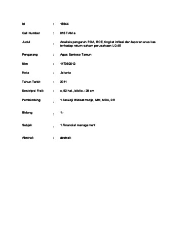 Santoso Tamun, Agus (2011) Analisis pengaruh ROA, ROE, tingkat inflasi dan laporan arus kas terhadap return saham perusahaan LQ 45. Masters thesis, UNIVERSITAS TARUMANAGARA.