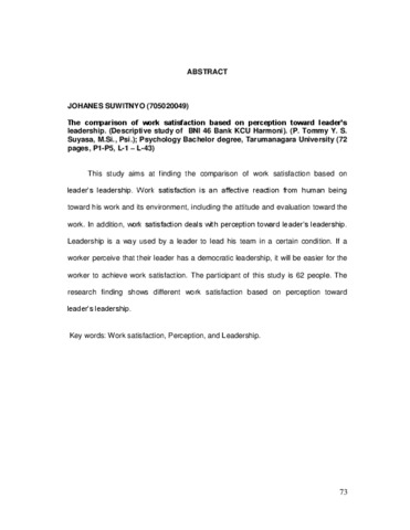 Suwitnyo, Johanes (2009) Perbandingan kepuasan kerja berdasarkan persepsi terhadap gaya kepemimpinan atasan (Studi pada karyawan BNI 46). Skripsi thesis, Universitas Tarumanagara.