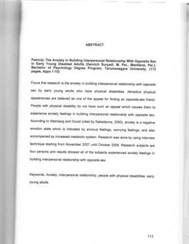Focus this research is the anxiety in building interpersonal relationship with opposite sex by early young adults who have physical disabilities. Attractive physical appearances are believed as one of the appeal for finding an opposite-sex friend. People with physical disability do not have such an appeal which causes them to experience anxiety feelings in building interpersonal relationship with opposite sex. According to Weinberg and Gould (cited by Satiadarma, 2000), anxiety is a negative emotion state which is indicated by anxious feelings, worrying feelings, and also accompanied by increased metabolic system. Research was done by using interview technique starting from November 2007 until October 2008. Research subjects are four persons and results showed all of the subjects experienced anxiety feelings in building interpersonal relationship with opposite sex .