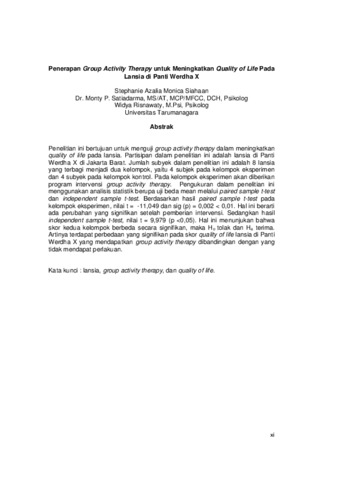 Siahaan, Stephanie Azalia Monica (2016) Penerapan group activity therapy untuk meningkatkan quality of life pada lansia di Panti Werdha X. Masters thesis, Universitas Tarumanagara.