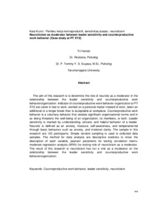 The aim of this research is to determine the role of neurotic as a moderator in the relationship between the leader sensitivity and counterproductive work behaviororganization. Indicator of counterproductive work behavior-organization at PT XYZ are came in late to work, worked on a personal matter instead of work, taken an additional or a longer break than is acceptable at workplace. Counterproductive work behavior is a voluntary behavior that violates significant organizational norms and in so doing threatens the well-being of an organization, its members, or both. Leader sensitivity is marked by understanding, sincere, and helpful behavior of a leader. Neurotic is defined as an anxiety, insecure, self-awareness, and temperamental through basic behaviors such as anxiety, and irrational clarity. The sample in this research are 123 participants. Simple random sampling is used to collected data samples. The method for data analysis are descriptive statistics to know the description of each variable, pearson parametric for testing correlation matrix, moderate regression analysis (MRA) for testing role of neuroticism as a moderator. The result of this research is neuroticism has not a role as a moderator on the relationship between the leader sensitivity and counterproductive work behaviororganization.
