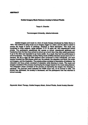Guided imagery and music is a form of music therapy introduced by Helen Bonny in 1970. This method is using music as an imagery trigger to a client, and the client is asked to portray the image in forms of paintings, drawings or literal description. This study was conducted to three subjects, range between 12 to 18 years old, who experenced school phobia. The participants repetiitiously felt nausea at school, experienced giddiness and headaches from the time they arrieved at school up to lunch time; they often asked permission to go to the clinic and requested to go home earlier. As a result they had low performance in school evaluation. The Hamilton Anxiety Rating Scale (HARS) indicated sececre level of 37-41 (severe). Six (6) to Eight (8) GIM sessions were conducted to the individually, each session inclueded the GIM phases which are: the prelude, the relaxation and focus, the music and imagery, and the integration. The prelude phase consisted of description of problems, the relaxation and focus phase consisted of relaxion while listening to music. The music and imagery consisted of the process of portraying the images based on the music being listened. The integration phase consisted of the process of expressing the images into drawings or phobia was ellminated, the anxiety is decreased, and the participants now has returned to school normally.