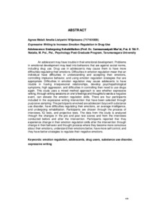 An adolescent may have trouble in their emotional development. Problems in emotional development may lead into behaviors that are against social norms, including drug use. Drug use in adolescents may cause them to have more difficulties regulating their emotions. Difficulties in emotion regulation mean that an individual have difficulties in understanding and accepting their emotions, controlling implusive behavior, and using emotion regulation strategies that are appropriate. Difficulties in emotion regulation may cause adolecents to have trouble in having interpersonal relationships, develop psychopathological symptoms, high aggression, and difficulties in controlling their need to use drugs again. This study uses a mixed method approach to see whether expressive writing, through writing sessions on one’s feelings and thoughts towards a negative event, can elevate the emotion regulation skills. There are four participants included in the expressive writing intervention that have been selected through purposive sampling. The participants envolved are adolescent boys with substance use disorder, have difficulties regulating their emotions, an average intelligence, and undergoing rehabilitation. Participants are chosen through the process of interviews, IQ tests, and projective tests. The data from this study is analyzed through the changes in the pre and post test scores and from the interviews conducted before and after the intervention. Participants reported that they experience change in their emotion regulation skills after the intervention through change in their behavior and thought process where they become more conscious about their emotions, understand their emotions better, have more self control, and they have better strategies to regulate their negative emotions.