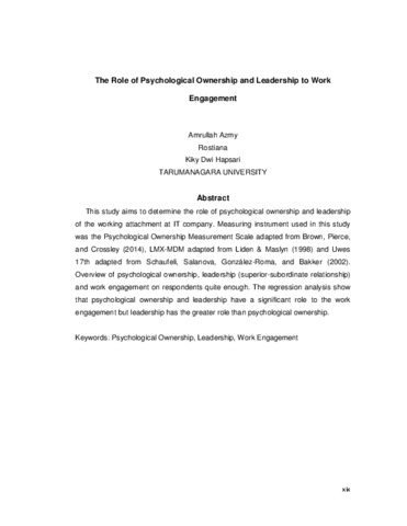 This study aims to determine the role of psychological ownership and leadership of the working attachment at IT company. Measuring instrument used in this study was the Psychological Ownership Measurement Scale adapted from Brown, Pierce, and Crossley (2014), LMX-MDM adapted from Liden & Maslyn (1998) and Uwes 17th adapted from Schaufeli, Salanova, González-Roma, and Bakker (2002). Overview of psychological ownership, leadership (superior-subordinate relationship) and work engagement on respondents quite enough. The regression analysis show that psychological ownership and leadership have a significant role to the work engagement but leadership has the greater role than psychological ownership.