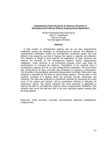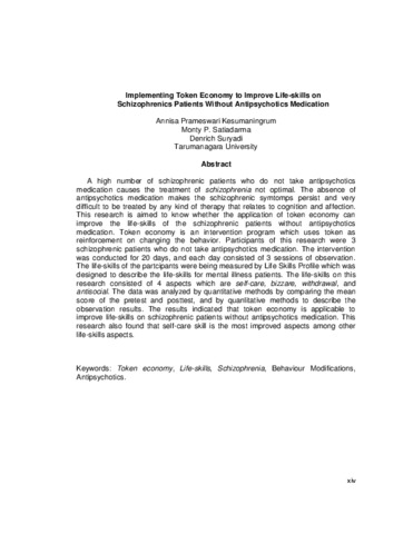 A high number of schizophrenic patients who do not take antipsychotics medication causes the treatment of schizophrenia not optimal. The absence of antipsychotics medication makes the schizophrenic symtomps persist and very difficult to be treated by any kind of therapy that relates to cognition and affection. This research is aimed to know whether the application of token economy can improve the life-skills of the schizophrenic patients without antipsychotics medication. Token economy is an intervention program which uses token as reinforcement on changing the behavior. Participants of this research were 3 schizophrenic patients who do not take antipsychotics medication. The intervention was conducted for 20 days, and each day consisted of 3 sessions of observation. The life-skills of the partcipants were being measured by Life Skills Profile which was designed to describe the life-skills for mental illness patients. The life-skills on this research consisted of 4 aspects which are self-care, bizzare, withdrawal, and antisocial. The data was analyzed by quantitative methods by comparing the mean score of the pretest and posttest, and by quanlitative methods to describe the observation results. The results indicated that token economy is applicable to improve life-skills on schizophrenic patients without antipsychotics medication. This research also found that self-care skill is the most improved aspects among other life-skills aspects.