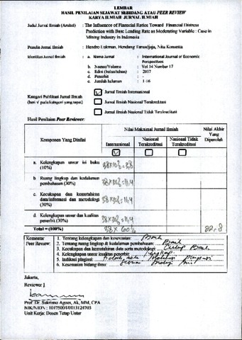 Hendro Lukman,S.E., M.M, Ak., CPMA., CA, CPA (Aust.) CSRS, peer review and Hendang Tarusdjaja, peer review and Nita Konsetta, peer review (2017) Peer Review 02 Hendro Lukman,S.E., M.M, Ak., CPMA., CA, CPA (Aust.) CSRS,Hendang Tarusdjaja dan Nita Konsetta. Review The Influencce of Financial Ratios Toward Financial Distress Prediction with Base Lending Rate as Moderating Variable : Case in Mining Industry in Indonesia, 14 (17). pp. 01-16. ISSN 0972-9380