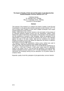 "The purpose of this research is to analyze the impact of quality of work life and the perception of job opportunities towards employee turnover intention at PT. FG and to analyze each variable to know which variable contributes more impact towards employee turnover intention.