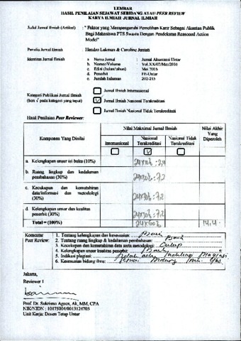 Hendro Lukman,S.E., M.M, Ak., CPMA., CA, CPA (Aust.) CSRS, peer review and Caroline Juniati, peer review (2016) Peer Review 05 Hendro Lukman,S.E., M.M, Ak., CPMA., CA, CPA (Aust.) CSRS & Caroline Juniati. Review : " Faktor yang Mempengaruhi Pemilihan Karir Sebagai Akuntan Publik Bagi Mahasiswa PTS Swasta Dengan Pendekatan Reasoned Action Model", XX (2). pp. 202-215. ISSN 1410-3591