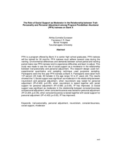 PPA is a program offered by Bank X to senior high school graduates. PPA trainees will be trained for 30 months. PPA trainees must adhere several rules during the training. Environmental differences and demands between school period and training period make new PPA trainees tend to experience difficulties and learn to adjust. This study was made to see the role of social support as a moderator in the relationship between trait-personality and personal adjustment. The research design used non-experimental quantitative and sampling technique used purposive sampling. Participants were the first year PPA trainees at Bank X. Participants were taken from 107 person (24 male; 83 female) in the age range 18 to 21 years old. The results showed that 1) Social support was significant as moderator in the relationship between neuroticism and personal adjustment, when neuroticism was tested for personal adjustment (R2=0.400; p<0.05), when neuroticism is tested together with social support for personal adjustment (R2=0.585; p<0.05), R2 has improved; 2) Social support was significant as moderator in the relationship between conscientiousness and personal adjustment, when conscientiousness was tested for personal adjustment (R2=0.204; p<0.05), when conscientiousness is tested together with social support for personal adjustment (R2=0.433; p<0.05), R2 has improved.