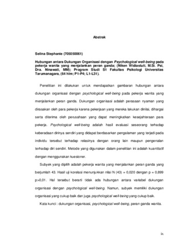 Stephanie, Selina (2009) Hubungan Antara Dukungan Organisasi dengan Psychological Well Being pada Pekerja Wanita yang Menjalankan Peran Ganda. Skripsi thesis, Universitas Tarumanagara.
