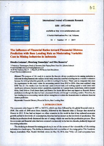 Hendro Lukman,S.E., M.M, Ak., CPMA., CA, CPA (Aust.) CSRS, peer review and Hendang Tarusdjaja, peer review and Nita Konsetta, peer review (2017) Review Doc. Hendro Lukman,S.E., M.M, Ak., CPMA., CA, CPA (Aust.) CSRS, Hendang Tarusdjaja & Nita Konsetta. Review Doc. The Influencce of Financial Ratios Toward Financial Distress Prediction with Base Lending Rate as Moderating Variable : Case in Mining Industry in Indonesia, 14 (17). pp. 01-16. ISSN 0972-9380