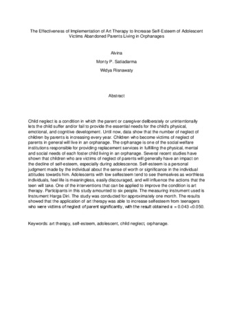 Alvina, A (2018) Efektivitas Penerapan Art Therapy untuk Meningkatkan Self-Esteem Remaja Korban Penelantaran Orangtua yang Tinggal di Panti Asuhan. Masters thesis, Universitas Tarumanagara.