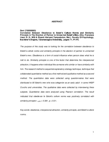 The purpose of this study was to looking for the correlation between obedience to Batak’s culture norms and similarity principle in the election of partner to unmarried Batak’s men. Obedience is a form of social influence when person does what he is told to do. Similarity principle is one of the factor that determine the interpersonal attraction, it happens when individual like someone who similar or have similarity with him. The research method is sequential explanatory strategy technique, technique that collaborated quantitative method as a first method and qualitative method as a second method. The quantitative data were collected using questionnaires that were distributed to 85 Batak’s men who was categorize as an early adult in some HKBP Crurchs and universities. The qualitative data were collected by interviewing three subjects. Quantitative data were analyzed using Pearson correlation. The result indicated that obedience to Batak’s culture norms was positively correlated with similarity principle r xy(85) = 0.381, p < 0.01.