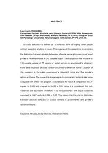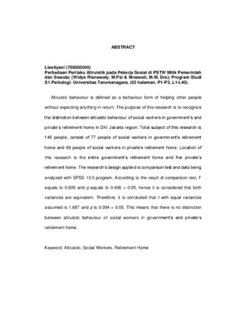 Liestiyani, Liestiyani (2010) Perbedaan perilaku altruistic pada pekerja sosial di PSTW milik pemerintah dan swasta. Skripsi thesis, Universitas Tarumanagara.