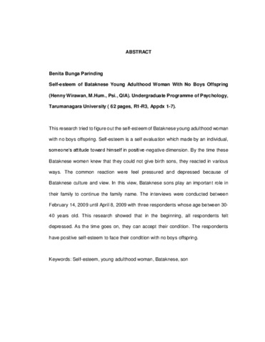 Bunga Parinding, Benita (2009) Self-esteem perempuan dewasa awal keturunan batak yang tidak mempunyai anak laki-laki. Skripsi thesis, Universitas Tarumanagara.