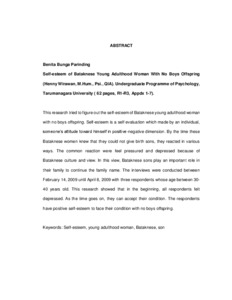 This research tried to figure out the self-esteem of Bataknese young adulthood woman with no boys offspring. Self-esteem is a self evaluation which made by an individual, someone’s attitude toward himself in positive-negative dimension. By the time these Bataknese women knew that they could not give birth sons, they reacted in various ways. The common reaction were feel pressured and depressed because of Bataknese culture and view. In this view, Bataknese sons play an important role in their family to continue the family name. The interviews were conducted between February 14, 2009 until April 8, 2009 with three respondents whose age between 30-40 years old. This research showed that in the beginning, all respondents felt depressed. As the time goes on, they can accept their condition. The respondents have positive self-esteem to face their condition with no boys offspring.