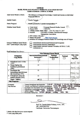 Agus Zainul Arifin, peer review (2017) Review 04 Agus Zainul Arifin. Review : The Influence of Financial Knowledge, Control and Income on Individual Financial Behavior., XX (3a). pp. 635-648. ISSN 1108-2976